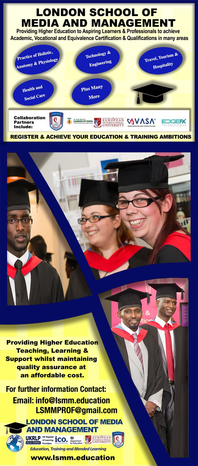 Overall, all our courses and programmes provide a comprehensive and progressive provision of learning with supported by the teaching and learning resources and lab packages. Our vision overall is to make the LONDON SCHOOL OF MEDIA AND MANAGEMENT a place of choice and as a “PLACE OF EXCELLENCE FOR ACADEMIC, SKILLS AND VOCATIONAL LEARNING” where everyone succeeds and achieves their goals and ambitions. Our mission is to facilitate quality education with recognised and high-quality standards being maintained at affordable costs.